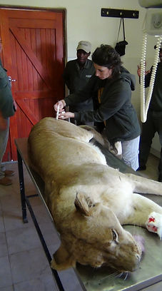 Piqûre d'antibio pour lionne blessée. NB : cette lionne n'est pas sauvage et ne fait pas partie de la réserve mais d'un centre sponsorisé par Shamwari qui récupère les félins maltraités (de zoos ou de résidences